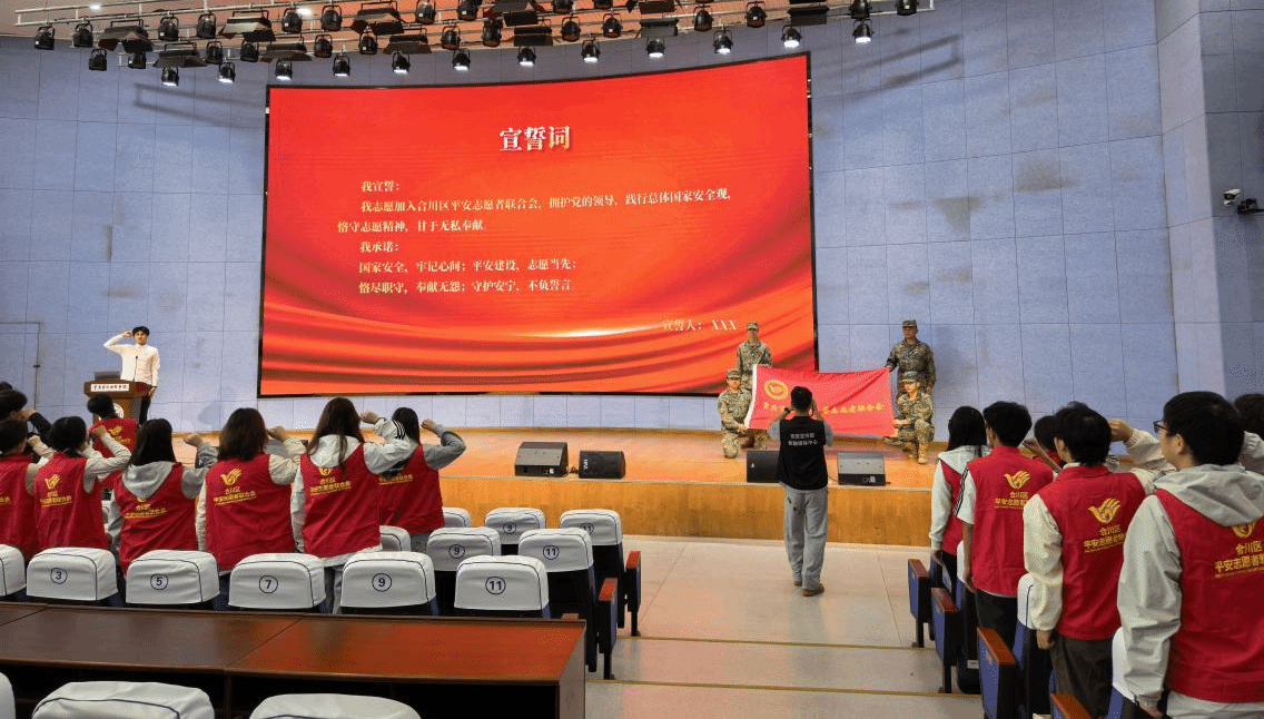 随后,合川区平安志愿者联合会志愿者宣誓仪式举行。全体志愿者庄严宣誓:拥护中国共产党领导、践行总体国家安全观、恪守志愿精神,以实际行动守护国家安全与校园平安,以青春之力扛起维护国家安全的责任担当。